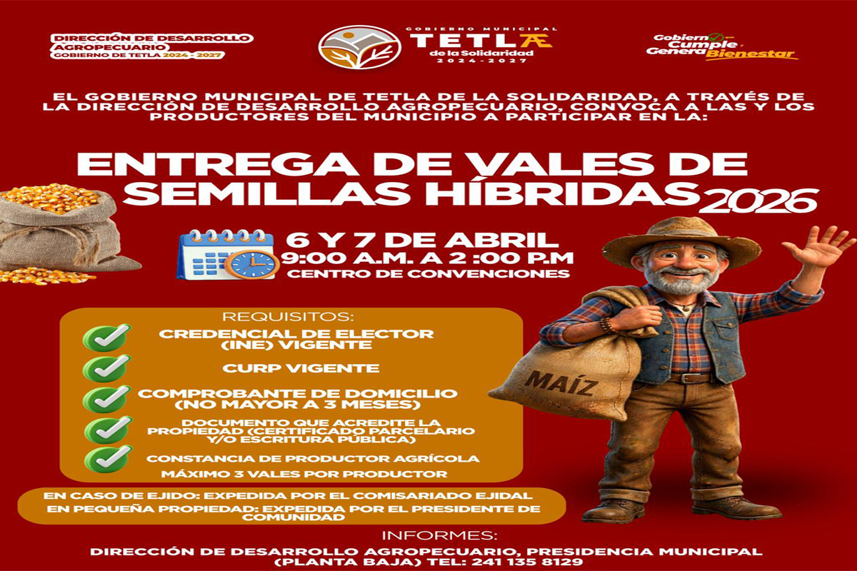 El Gobierno Municipal de Tetla de la Solidaridad, a través de la Dirección de Desarrollo Agropecuario, te invita a participar en la Entrega de Vales de Semillas Híbridas 2026. 📅...