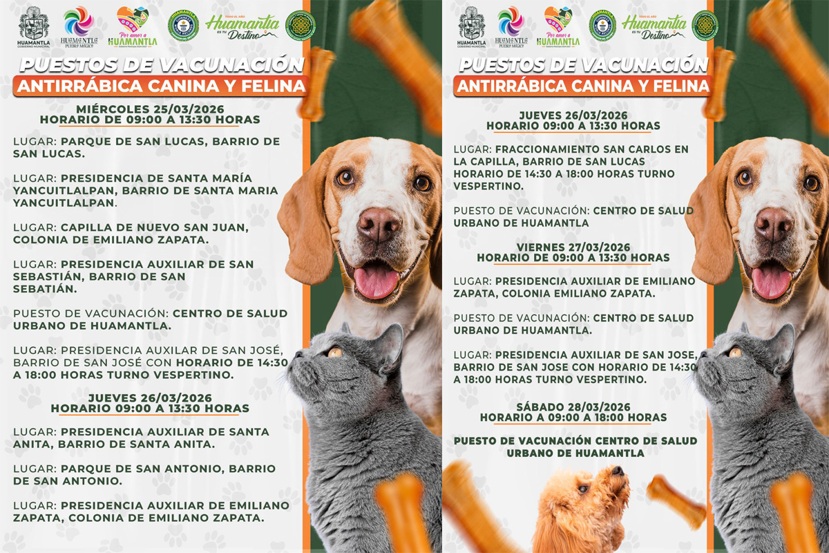 El Gobierno Municipal de Huamantla, en coordinación con el Centro de Salud Urbano, invita a la ciudadanía a participar en la Jornada de Vacunación Antirrábica Canina y Felina, que se...