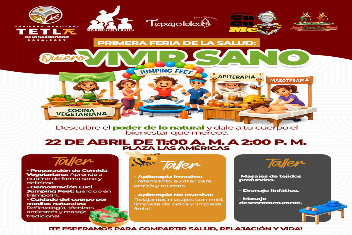 Este 22 de abril vive la Primera Feria de la Salud “Quiero Vivir Sano” con actividades para toda la familia: alimentación saludable 🥗, ejercicio 🏋️♀️, terapias naturales 🐝 y relajación....