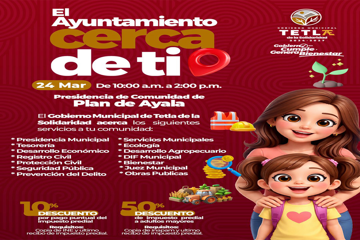 Este 24 de marzo, acercamos los servicios del Gobierno Municipal directamente a tu comunidad. 🤝 🕙 Horario: 10:00 a.m. a 2:00 p.m. 📌 Lugar: Presidencia de Comunidad de Plan de...