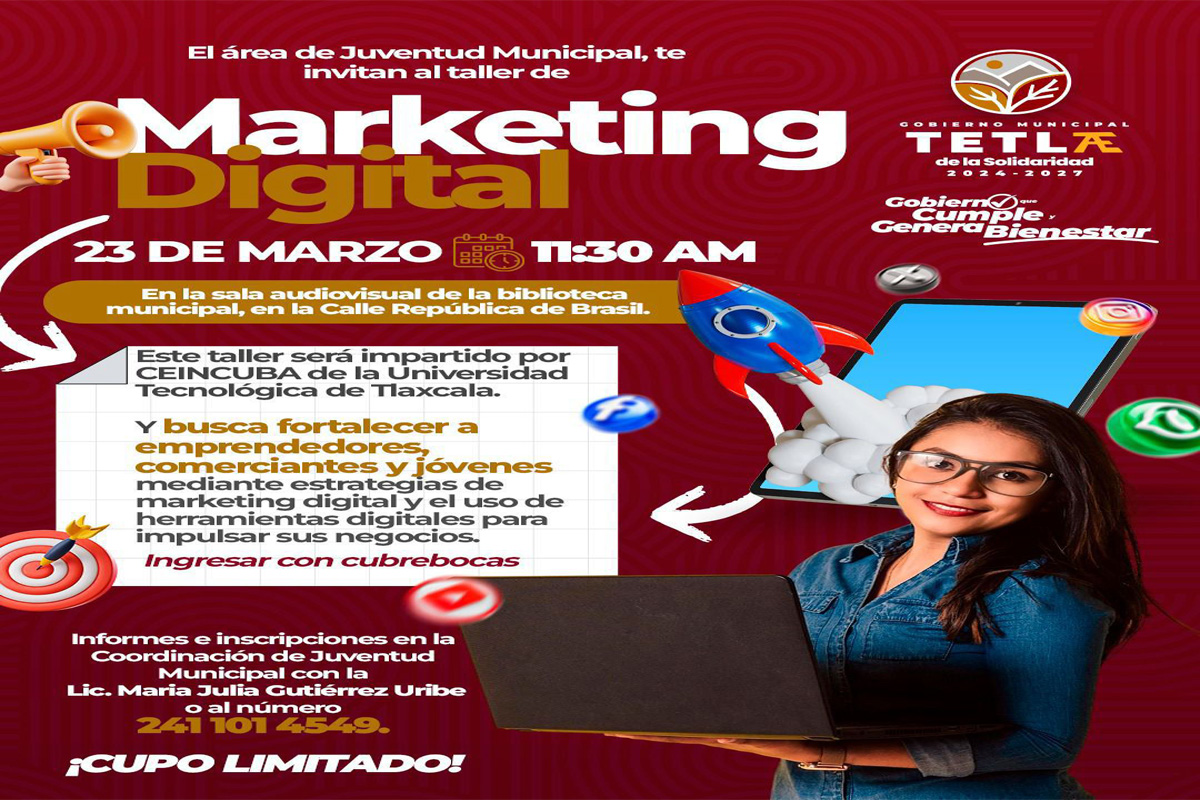 El área de Juventud Municipal te invita al Taller de Marketing Digital 💻, un espacio pensado para emprendedores, comerciantes y jóvenes que quieren fortalecer sus proyectos con estrategias digitales y...