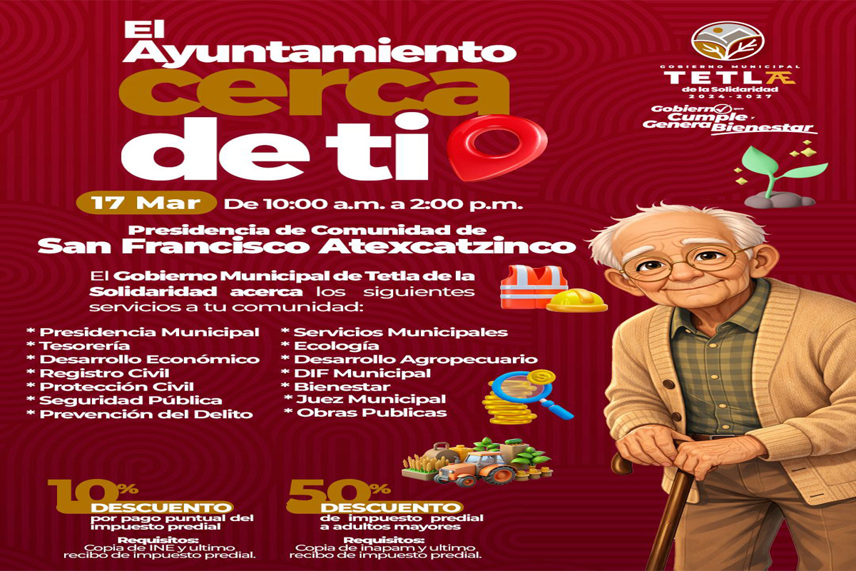El programa “El Ayuntamiento Cerca de Ti” visitará San Francisco Atexcatzinco. Acércate a la Presidencia de Comunidad y aprovecha los servicios municipales, apoyos y descuentos en impuesto predial. 🕙 10:00...