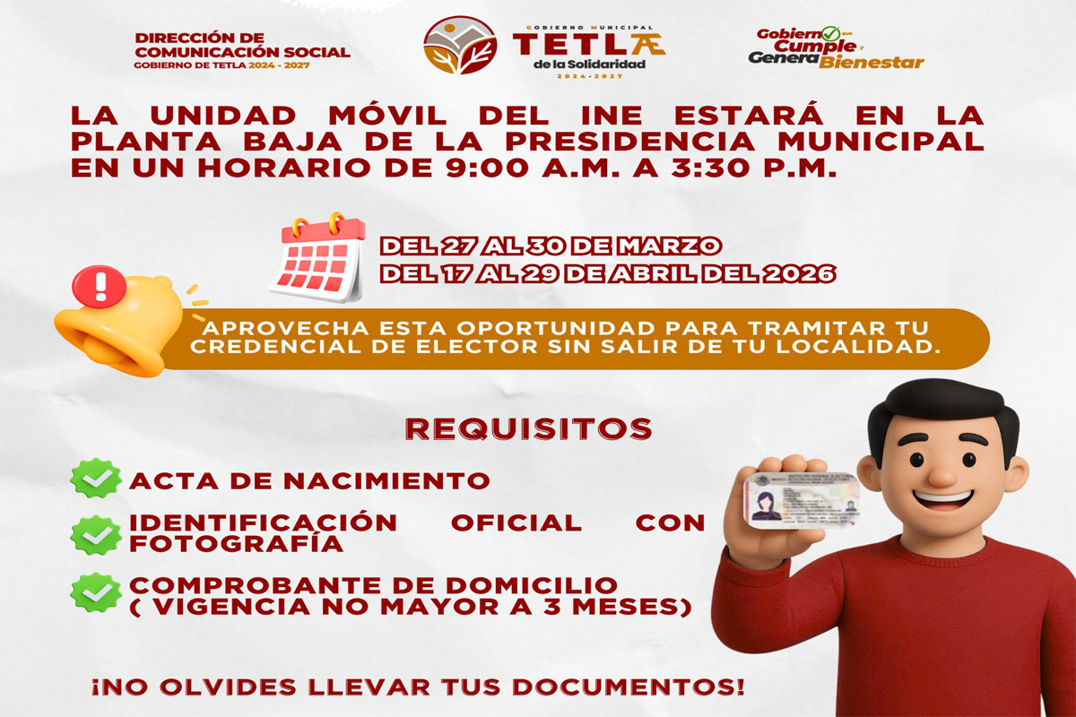 La Unidad Móvil del INE estará brindando servicio en la planta baja de la Presidencia Municipal de Tetla de la Solidaridad, en un horario de 9:00 a.m. a 3:30 p.m....
