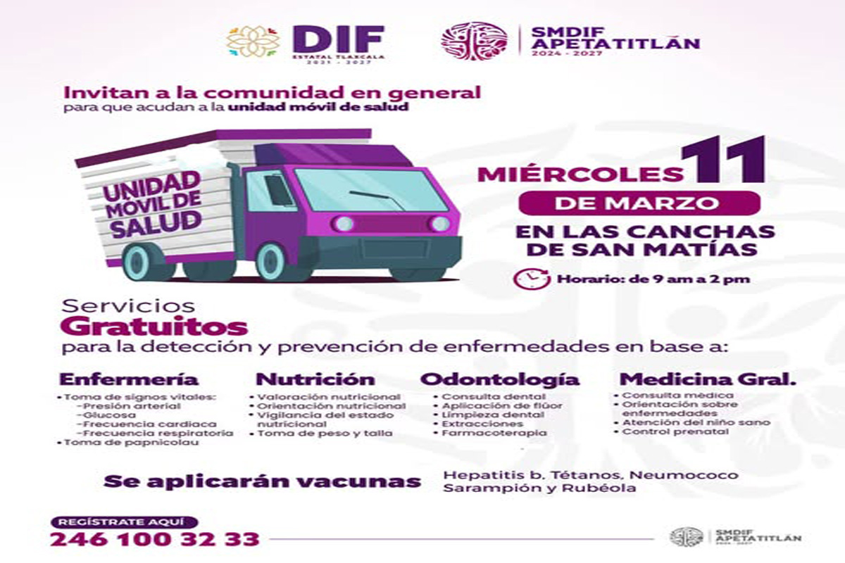 El SMDIF Apetatitlán, en coordinación con DIF Estatal Tlaxcala, invita a la comunidad a aprovechar los servicios médicos gratuitos para la detección y prevención de enfermedades. Miércoles 11 de marzo...