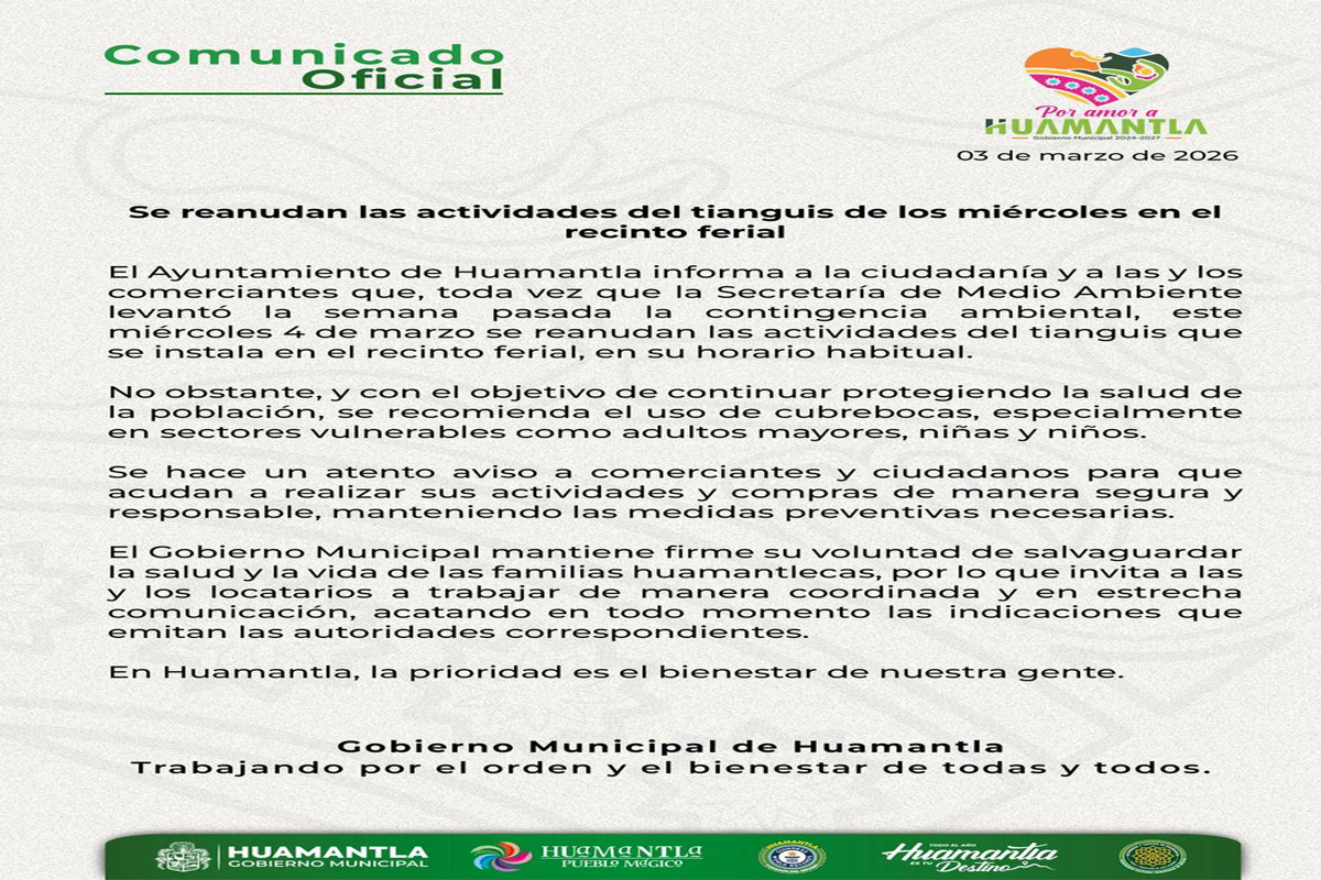 El Ayuntamiento de Huamantla informa a la ciudadanía y a las y los comerciantes que, toda vez que la Secretaría de Medio Ambiente levantó la semana pasada la contingencia ambiental,...