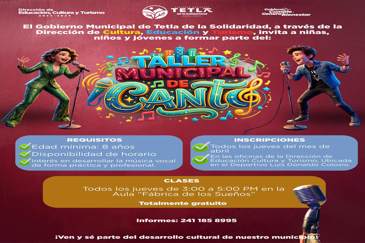 El Gobierno Municipal de Tetla de la Solidaridad, a través de la Dirección de Educación, Cultura y Turismo, te invita a formar parte del Taller Municipal de Canto 🎶 👧🧒...