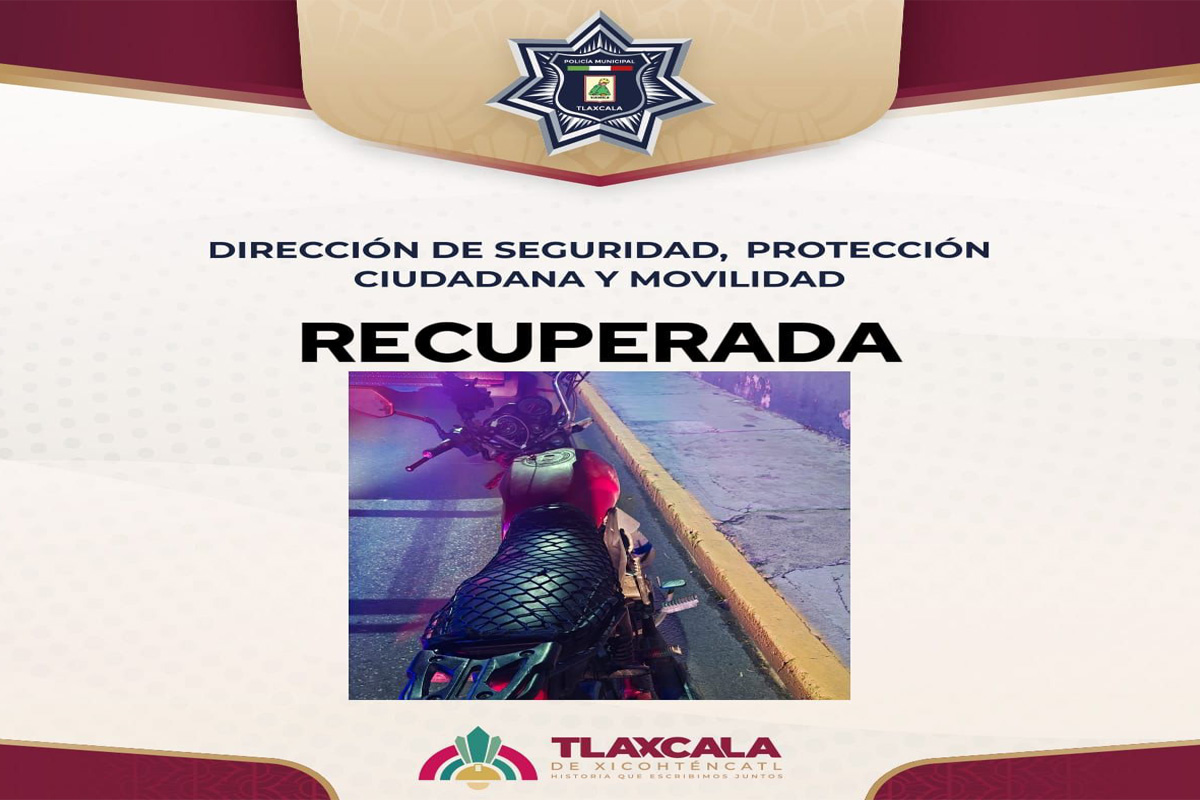 Elementos de la Dirección de Seguridad, Protección Ciudadana y Movilidad del Municipio de Tlaxcala recuperaron una motocicleta con reporte de robo durante un recorrido de vigilancia en el bulevar Ocotlán,...