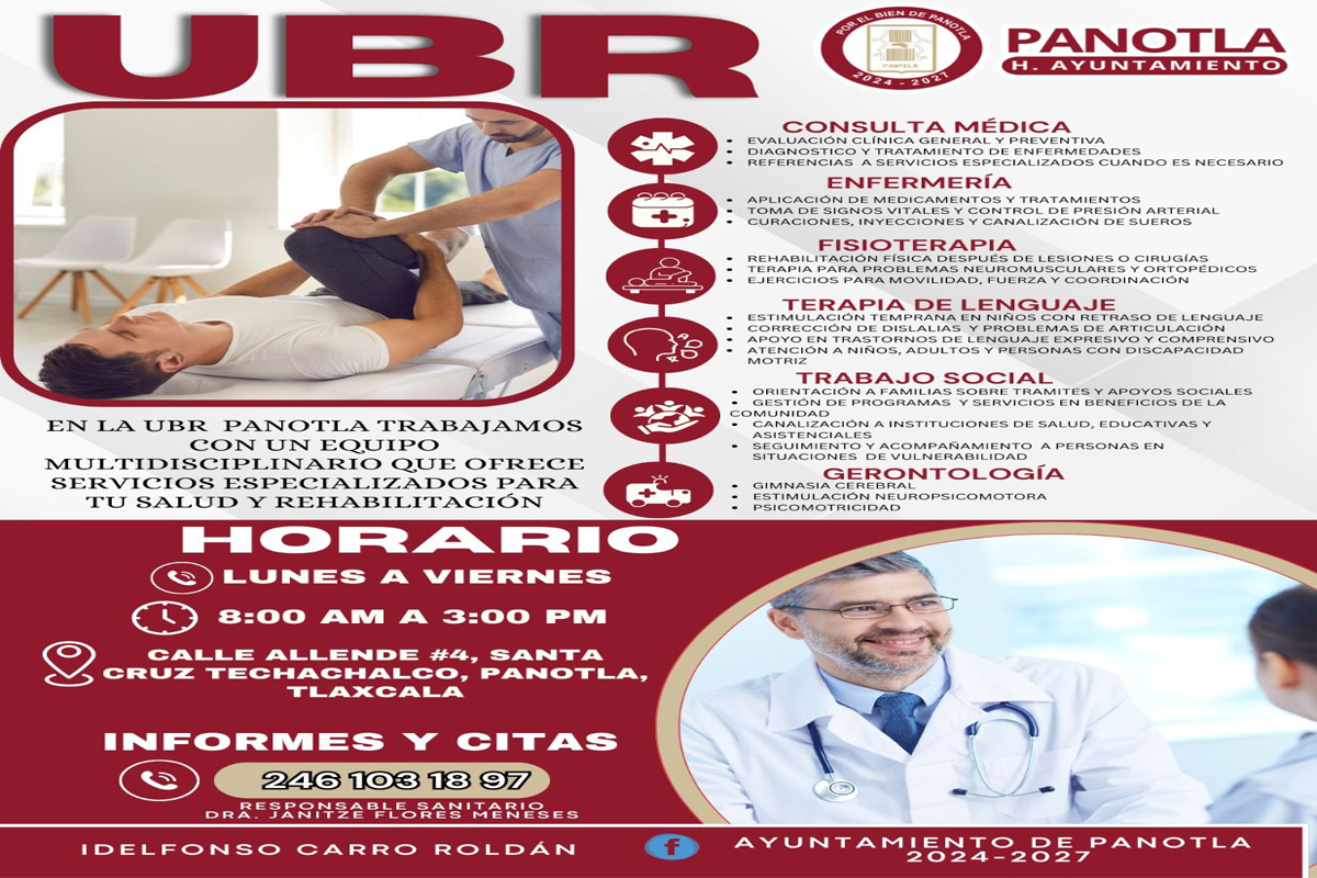 La UBR Panotla continúa brindando atención temporalmente en el Centro de Salud de Techachalco, con servicios de consulta médica, enfermería, fisioterapia, terapia de lenguaje, trabajo social y gerontología. Calle Allende...
