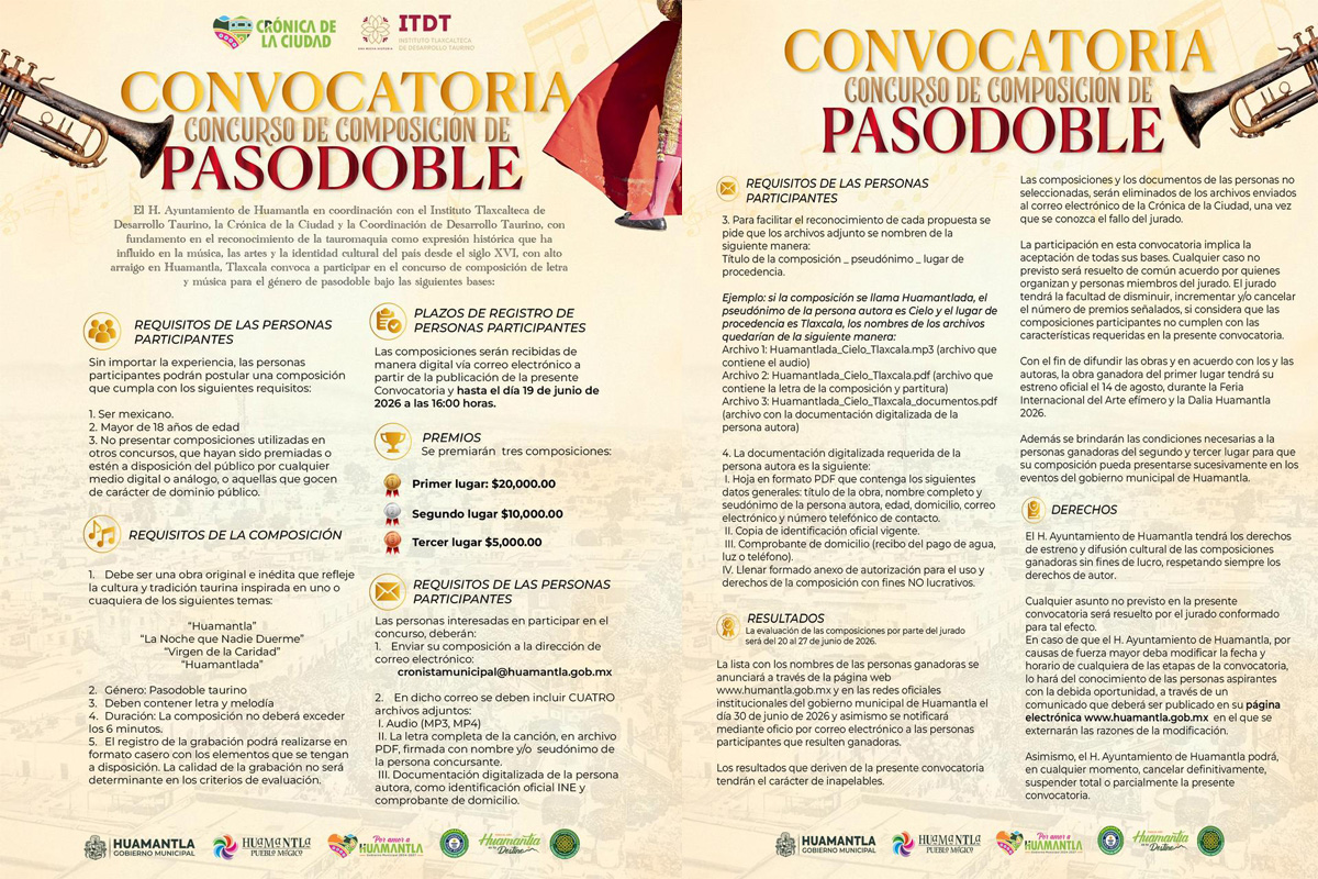 Con el objetivo de fortalecer y difundir una de las expresiones musicales más representativas de la tradición taurina, el Gobierno Municipal de Huamantla, en coordinación con el Instituto Tlaxcalteca de Desarrollo Taurino, la Crónica de la Ciudad y la Coordinación de Desarrollo Taurino, invita a la ciudadanía a participar en el Concurso de Composición de Pasodoble.