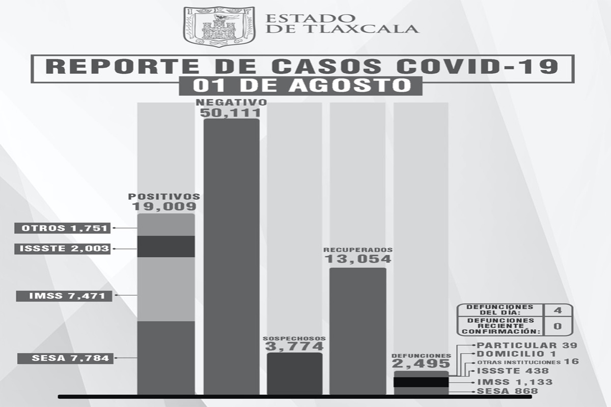 De acuerdo con el reporte del 01 de agosto, la Secretaría de Salud del Estado (SESA) confirmó dos personas recuperadas, cuatro fallecimientos y 66 casos positivos de Covid-19 de tlaxcaltecas...