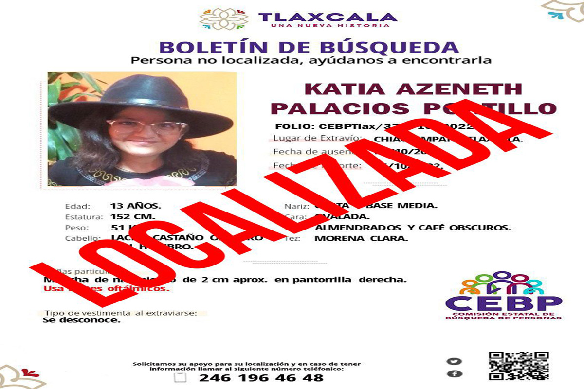 Katia Azenet Palacios Portillo ya está con su familia El Ayuntamiento de Tlaxcala informa que integrantes de la Dirección de Seguridad Ciudadana y Movilidad municipal localizaron esta mañana a una...