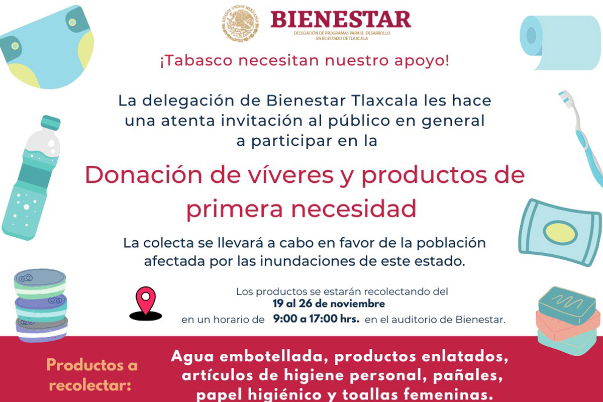 Se recibirán productos no perecederos en las oficinas de la dependencia federal en Tlaxcala. La delegación en Tlaxcala de la Secretaría de Bienestar invita a la sociedad en general a...