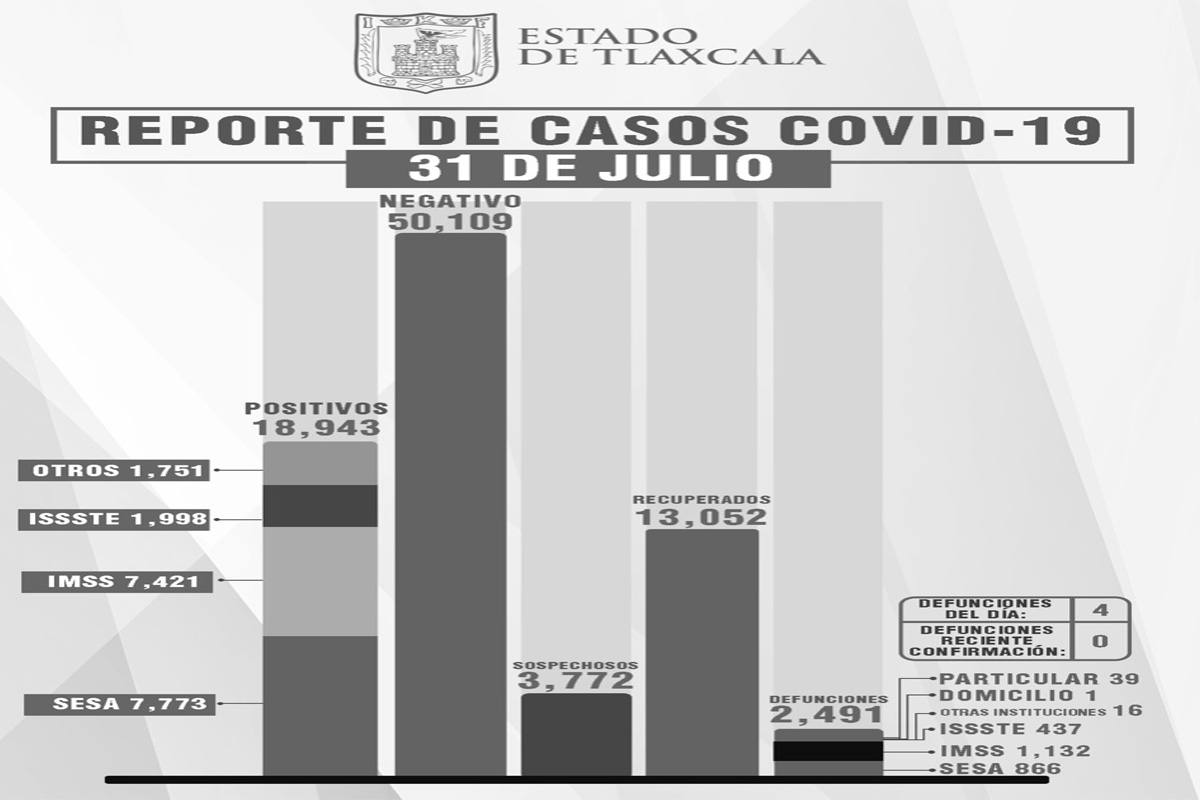 De acuerdo con el reporte del 31 de julio, la Secretaría de Salud del Estado (SESA) confirmó 27 personas recuperadas, cuatro fallecimientos y 64 casos positivos de Covid-19 de tlaxcaltecas...