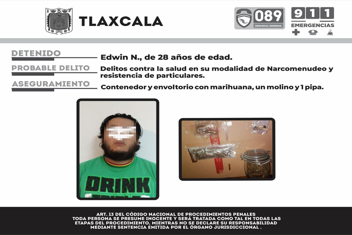 El detenido portaba una cantidad aproximada de marihuana que excede lo permitido por la Ley General de Salud en su artículo 479. Elementos de la Dirección de Seguridad región Tlaxco...