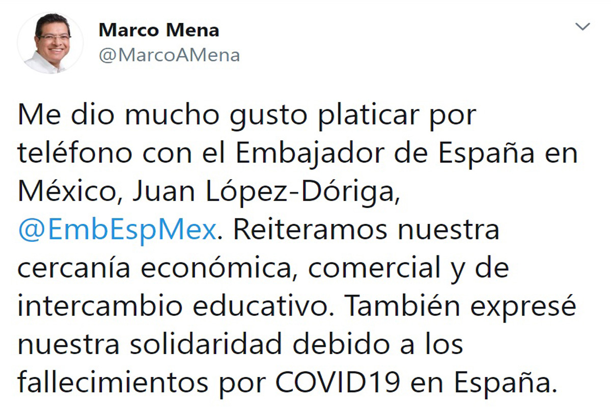 El Gobernador Marco Mena dio a conocer que platicó por teléfono con el Embajador de España en México, Juan López-Dóriga, con quien reiteró la cercanía económica, comercial y de intercambio...