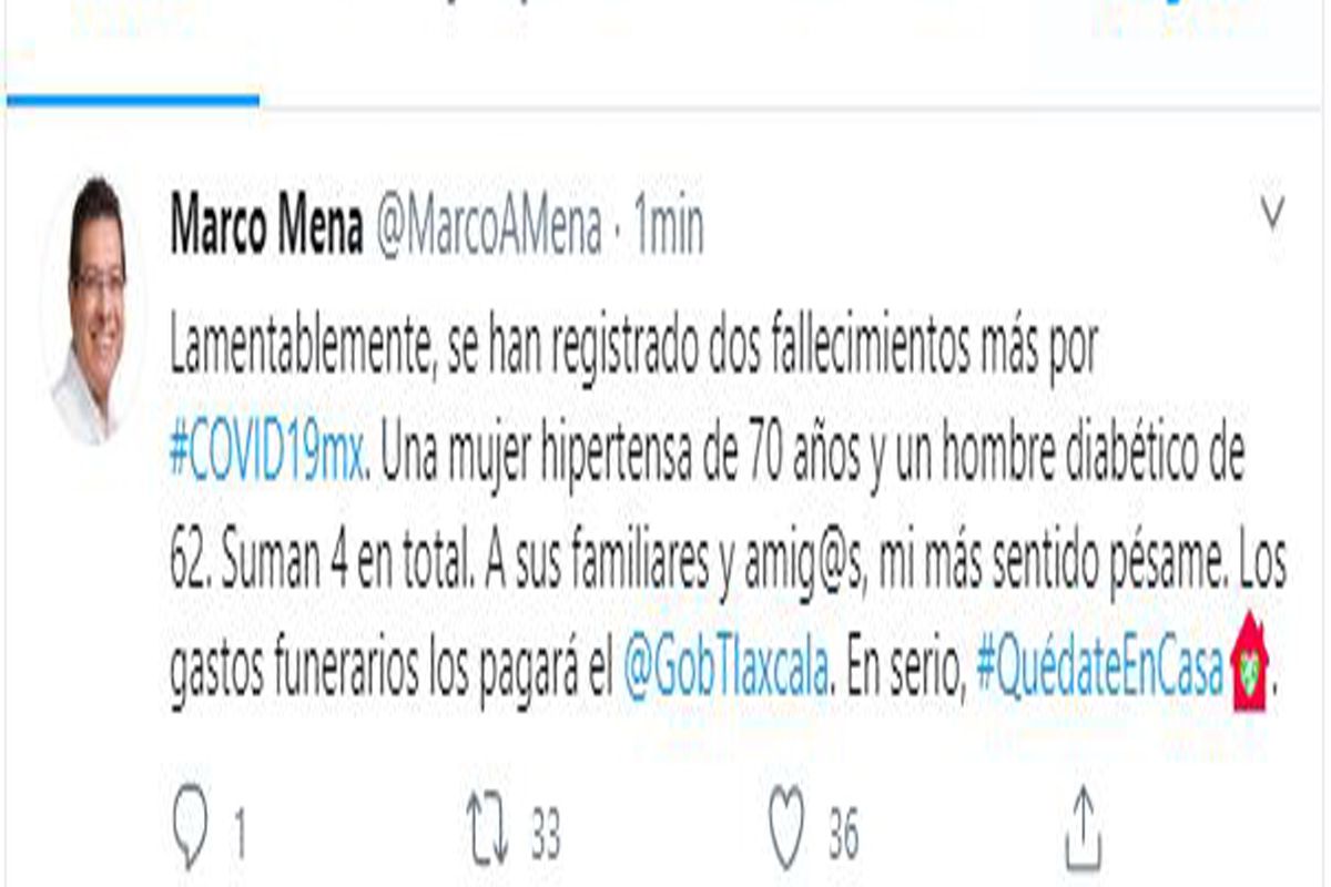 El gobernador de Tlaxcala Marco Mena a través de su cuenta de Twitter, anuncio el fallecimiento de dos personas más por COVID-19. Una mujer hipertensa de 70 años y un hombre diabético...