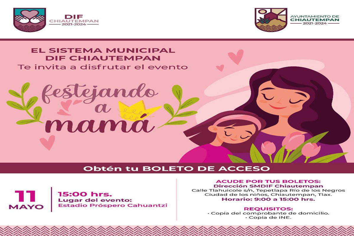 El Ayuntamiento de Chiautempan a través del Sistema Municipal para el Desarrollo Integral de la Familia (SMDIF), invita a las mamás del municipio a acudir al festival organizado por la...