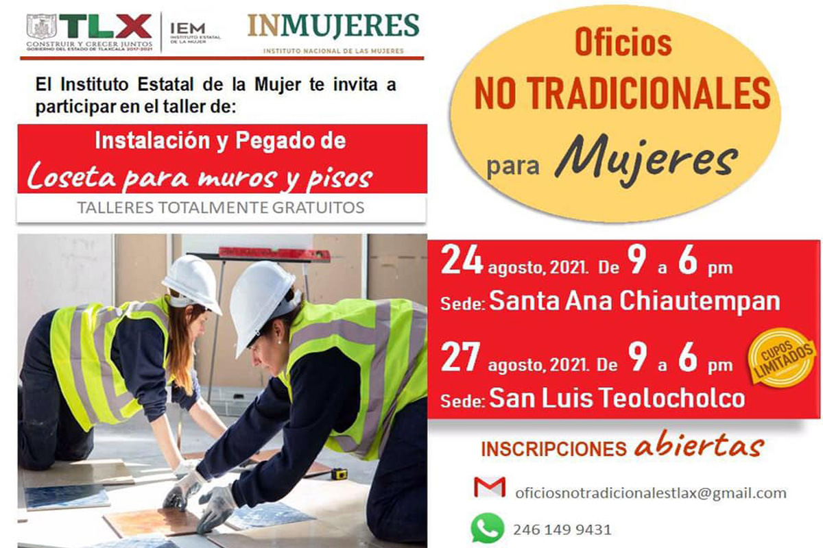 El Instituto Estatal de la Mujer (IEM), en coordinación con el Instituto Nacional de las Mujeres (Inmujeres), invita a tlaxcaltecas a participar en los talleres “Instalación y pegado de loseta...