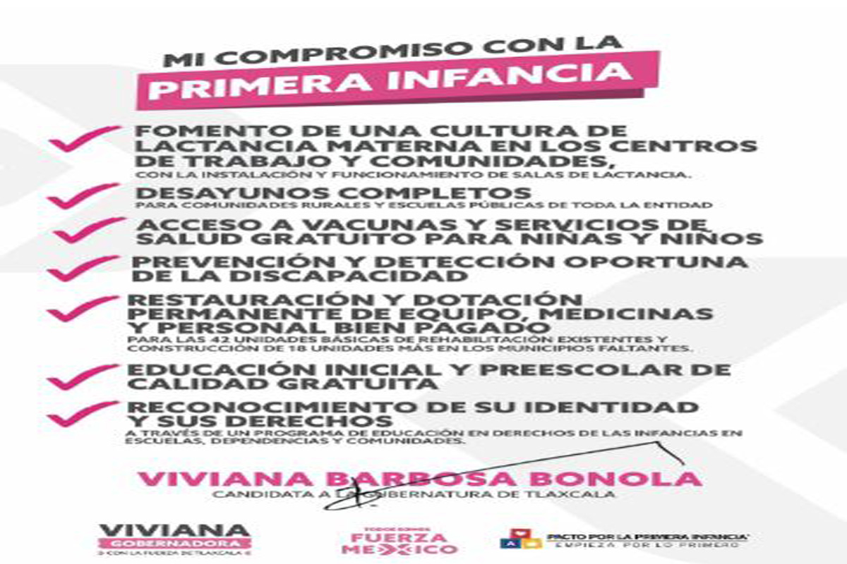 Noé Polvo M. La candidata del Partido Fuerza Por México, Viviana Barbosa Bonola, a través de sus redes sociales, anunció su compromiso con la nueva infancia.