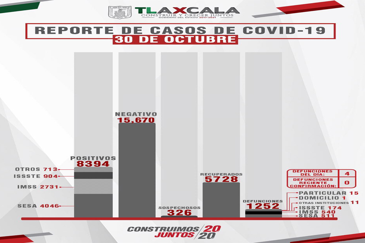 En otras entidades se confirmaron cuatro tlaxcaltecas más que resultaron positivos al virus. De acuerdo con el reporte del 30 de octubre, la Secretaría de Salud del Estado (SESA) confirmó...