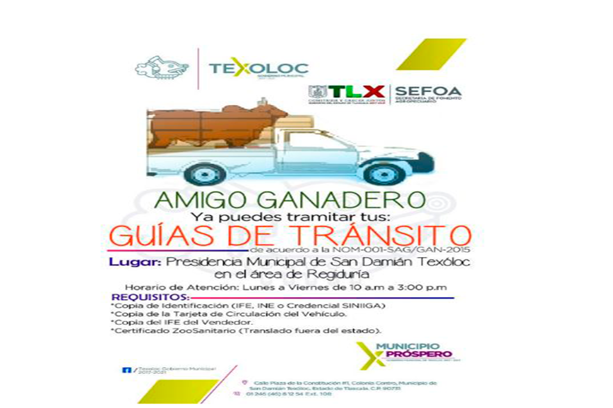 El Ayuntamiento de Texoloc, que preside Maribel Cervantes Hernández, convoca a todos los ganaderos a que se acerquen a la presidencia municipal a tramitar sus Guías de Transito, en el...