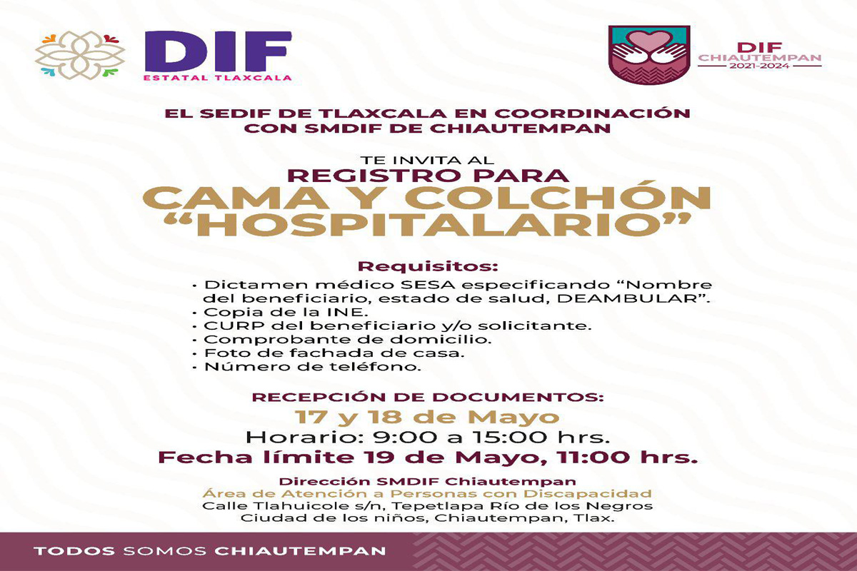 La fecha límite es el 19 de mayo a las 11:00 horas en las instalaciones del SMDIF. El Ayuntamiento de Chiautempan a través del Sistema Municipal para el Desarrollo Integral...